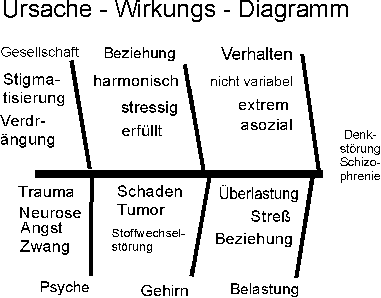 Es gibt dort ein japanisches Wort, das heißt Kaizen, was so viel bedeutet wie kontinuierlicher Verbesserungsprozeß. Man sollte sein Leben auch als einen solchen Prozeß begreifen. Um die Qualität des Produktes oder des Lebens zu verbessern, gibt es eine Methode, die sich Ishikawa-Diagramm, Fischgräten-Diagramm oder auch Ursache-Wirkungs-Diagramm nennt. Mit dieser Methode läßt sich der wahrscheinlichste Fehler eines Prozesses finden. Es wird mit den Oberbegriffen aufgebaut: Mensch, Maschine, Material, Messung, Milieu. Methode usw. Ich habe versucht solch ein Diagramm für Schizophrenie aufzubauen. Jeder könnte für sein Problem auch ein eigenes anderes Diagramm aufbauen. |